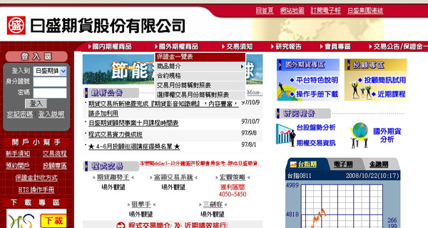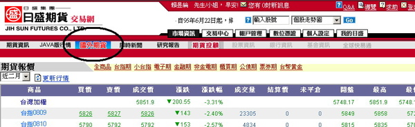 1.進入日盛期貨網站登入日盛期貨交易網,選"國外期貨",注意,這邊也可在hts左上方畫面代碼鍵入"4503"使用國外期貨