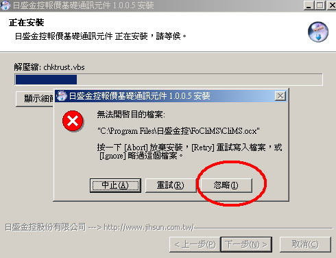 8.等待安裝,若其間有錯誤按"忽略"即可