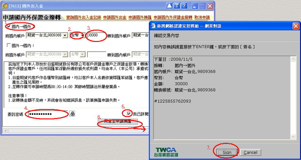 2.可選國內轉國外>幣別>金額>密碼>勾選我已詳讀>同意申請換匯>sign